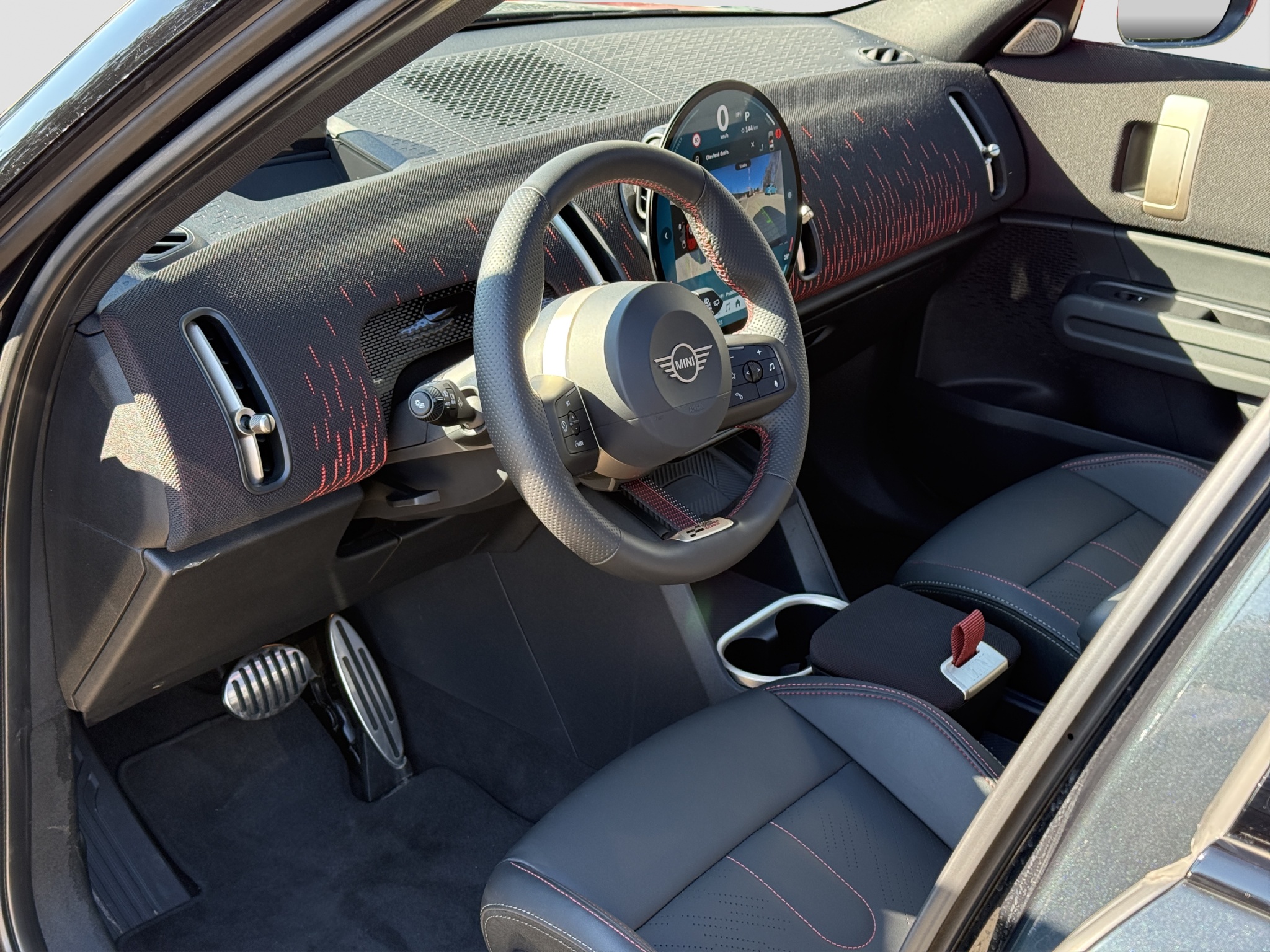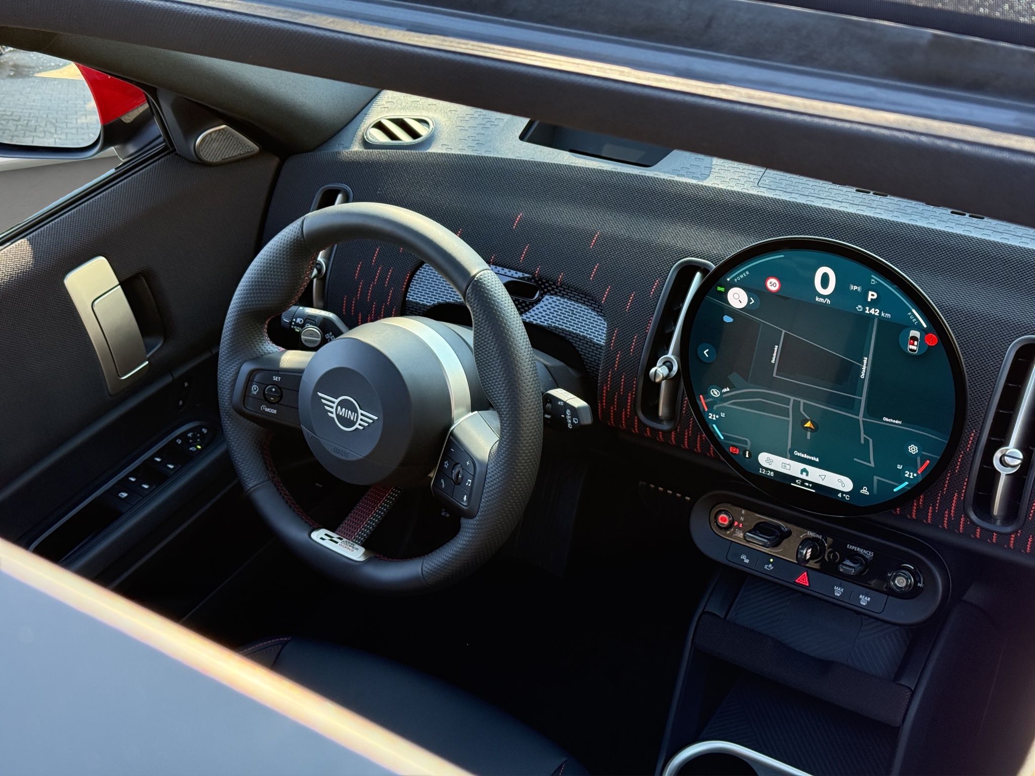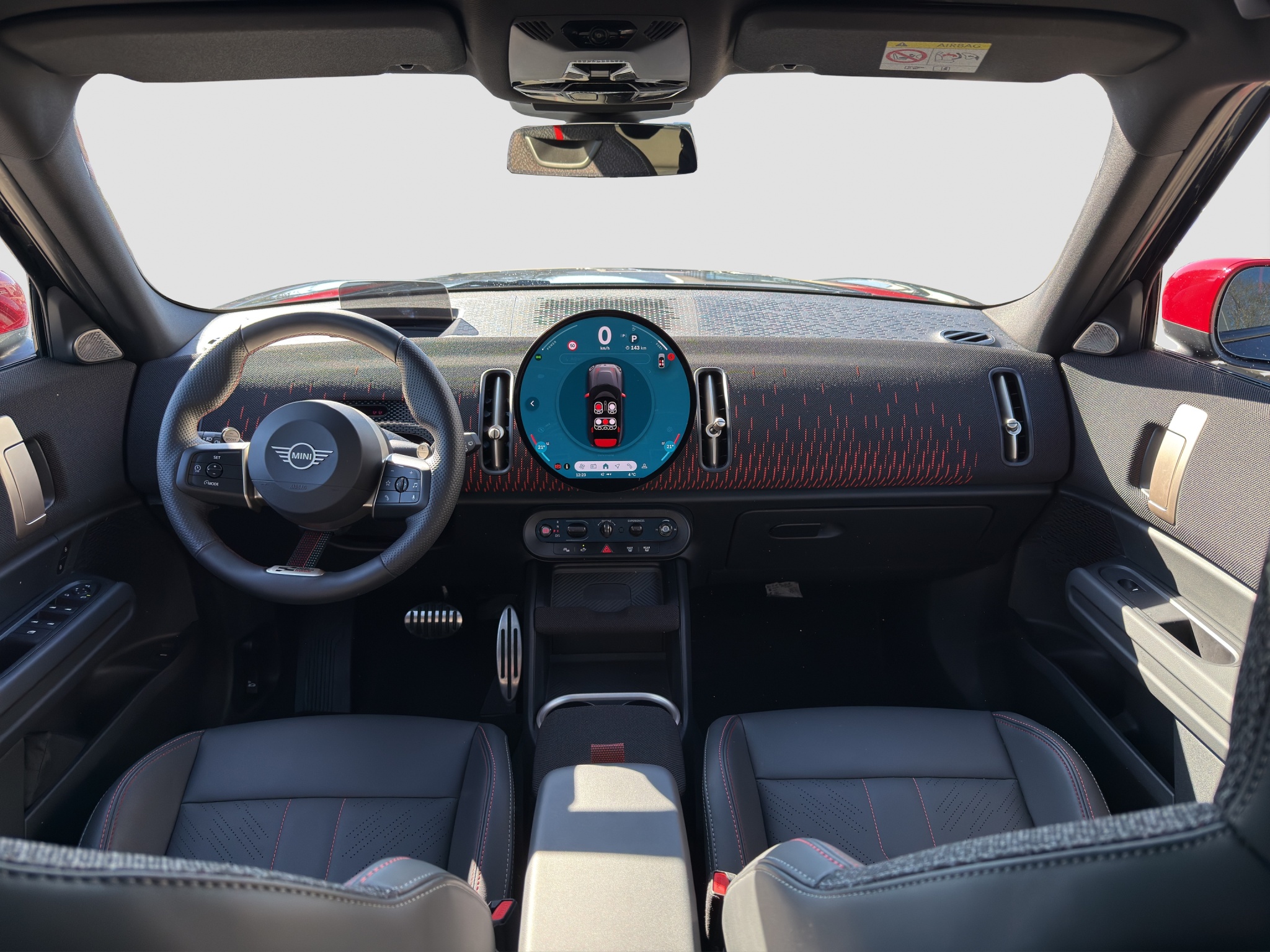 Nastupte dovnitř a sportovní sedadla MINI s perforovaným materiálem Vescin vyvolají exkluzivní pocit závodního vozu. Černo-červená kombinace ve stylu JCW je zřejmá na palubní desce i na výplních dveří. Se sportovním volantem JCW čalouněným černým materiálem Vescin