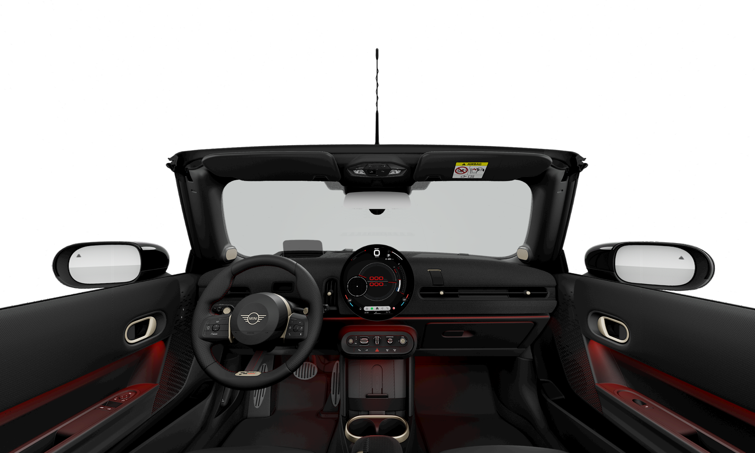 Nastupte dovnitř a sportovní sedadla MINI s perforovaným materiálem Vescin vyvolají exkluzivní pocit závodního vozu. Černo-červená kombinace ve stylu JCW je zřejmá na palubní desce i na výplních dveří. Se sportovním volantem JCW čalouněným černým materiálem Vescin